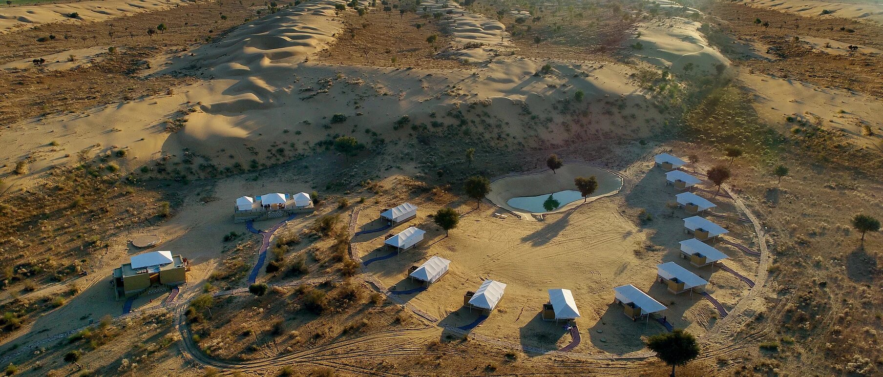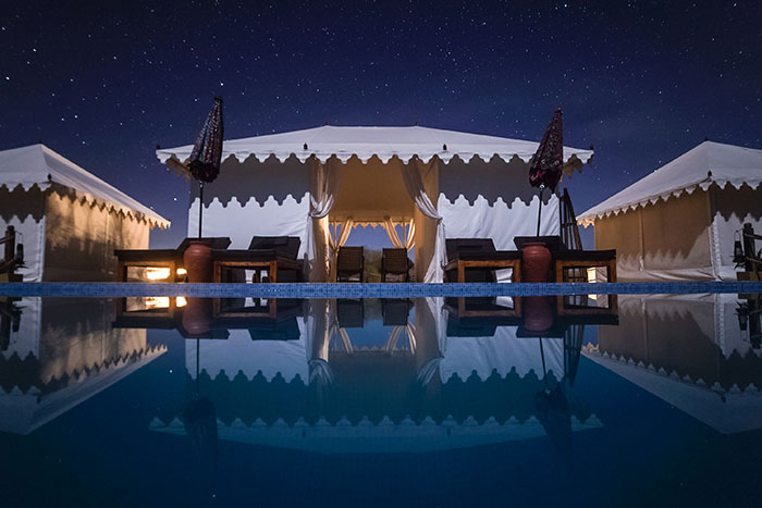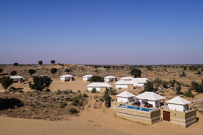 Situated at the heart of Rajasthan, surrounded by sand dunes and wildlife - Dhora is the destination for those who don't want to just visit Rajasthan but want to experience it at its purest. Located 100 km from Jodhpur, the resort is spread over 45 acres of desert at its rawest. Dhora is an oasis of luxury amidst endless sand dunes, which are also home to native wildlife like Indian Gazelles, Desert Foxes, Blue Bulls, Wild Boars and Hares. The resort has 15 tented suites facing a pond surrounded by sand dunes. Each tent comes with an en-suite bathroom, an open shower and a verandah. All tented suites have air conditioners and heaters to ensure your stay is comfortable, irrespective of the weather conditions. Beds carved out of unique locally sourced sandstone add to the rustic but luxurious vibe of the resort. Dhora features 2 spa tents and a plunge pool to help you relax and a dining area for you to relish the best of Rajasthani and continental cuisines.